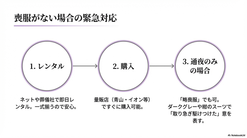 喪服を持っていない場合は、レンタルサービスや当日購入も選択肢となります。急な葬儀でも対応できるよう、事前に準備しておくと安心です。