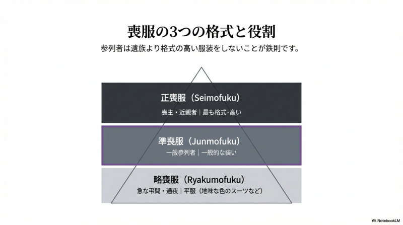 準喪服は正喪服の次に格式が高く、一般参列者が着用する標準的な喪服です。略喪服は最も格式が低く、通夜や急な参列で喪服が準備できない場合に着用します。ダークグレーや紺のスーツも略喪服に含まれます。