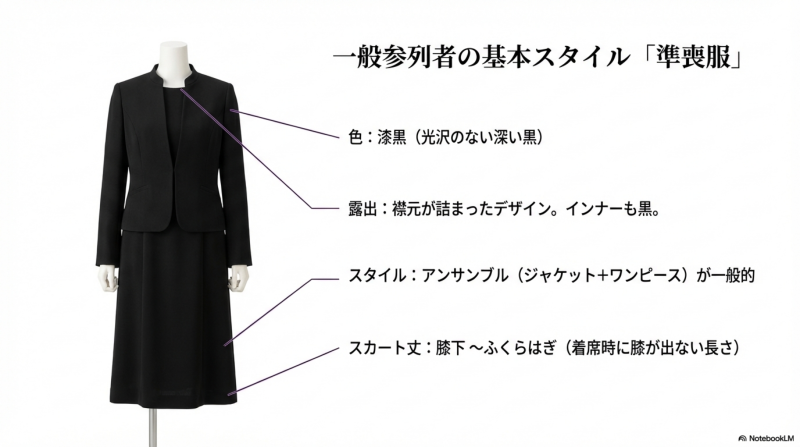 女性が葬儀に参列する際は、自分の立場に合った喪服を選ぶことが基本です。一般参列者であれば準喪服を選び、遺族より格式の高い服装は避けましょう。