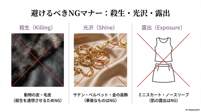 ⚠️ 重要なポイント:遺族より格式の高い服装をするのはマナー違反です。迷った場合は、少し控えめな装いを選びましょう。