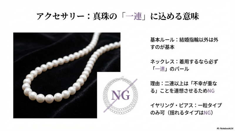 必須ではありませんが、葬儀での女性のアクセサリーとして最も適切な選択肢です。着用する場合は一連のものを選びましょう。二連以上は「不幸が重なる」とされ、マナー違反となります。