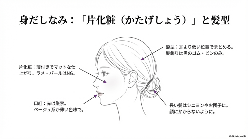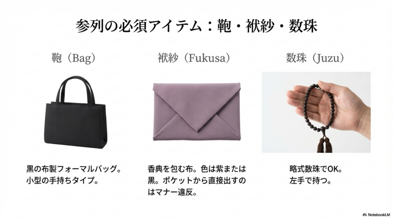 持ち物は数珠・袱紗・ハンカチを忘れずに準備しましょう。メイクは片化粧を心がけ、髪型は清潔感のあるスタイルに整えます。アクセサリーは最小限に抑え、パールネックレスを選ぶ場合は一連のものを着用してください。