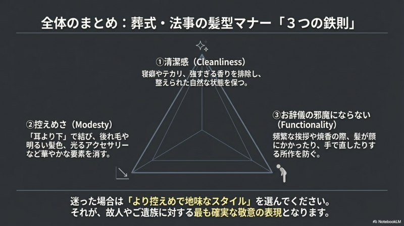 💡 髪型の選択に迷ったら、より控えめで厳格な方向に寄せておくことが無難です。特に故人との関係が近い場合や、格式を重んじる家庭の法要では、葬儀と同程度の厳粛さで臨むことをおすすめします。