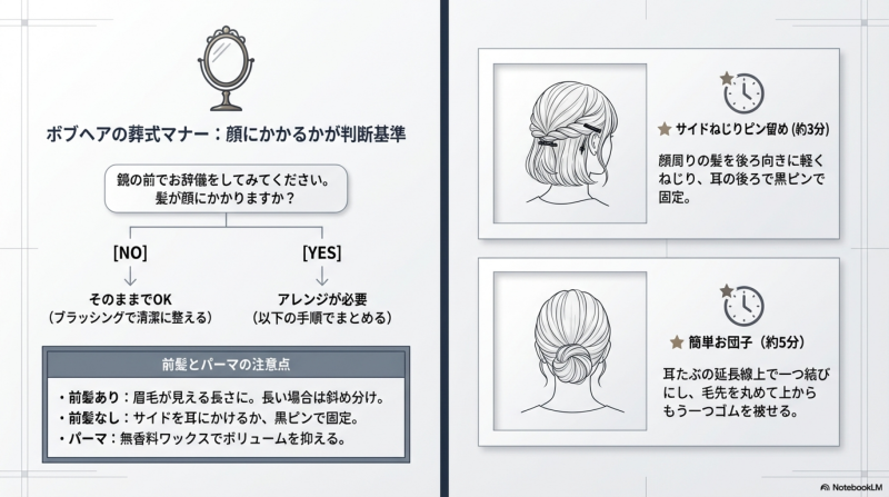 前髪なしボブは清潔感のある髪型として葬儀の場に適していますが、サイドの髪が顔にかかりやすいという注意点があります。