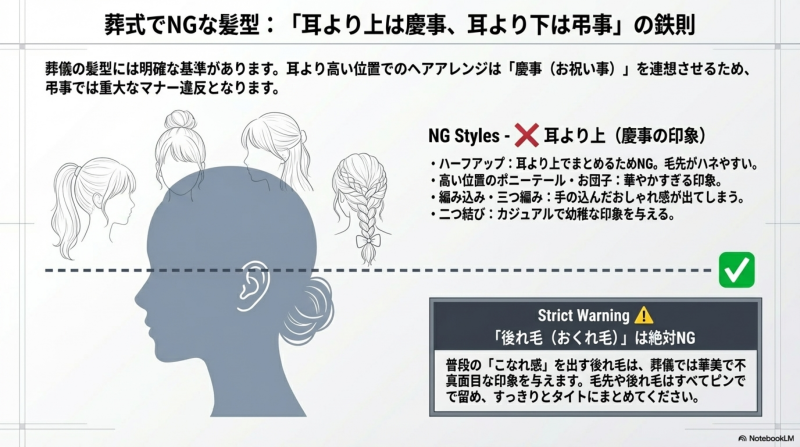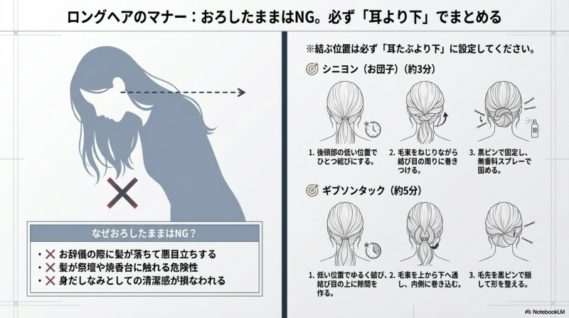 ⚠️ 重要:結ぶ位置は必ず耳より下にしてください。高い位置で結ぶとポニーテールのように華やかな印象になり、慶事を連想させてしまいます。