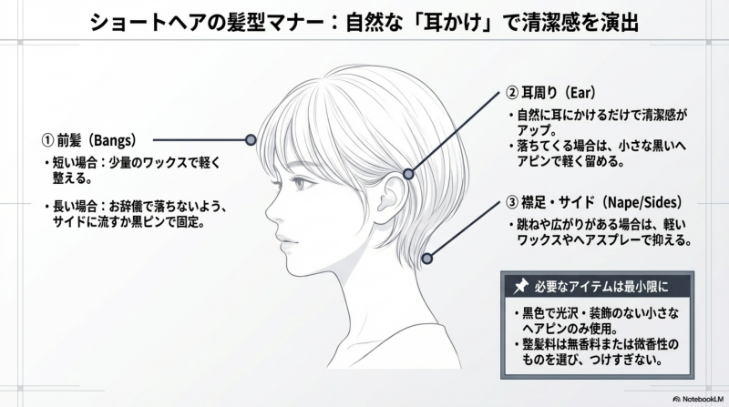 ショートヘアの場合、髪が顔にかからなければ特別なアレンジは必要ありません。自然なスタイルのままで十分ですが、清潔感を保つための基本的な整え方を覚えておきましょう。