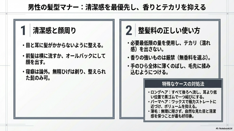 ⚠️ 判断のポイント:鏡の前で実際にお辞儀をしてみてください。そのときにサイドの髪が顔にかかるなら、何らかの対処が必要です。