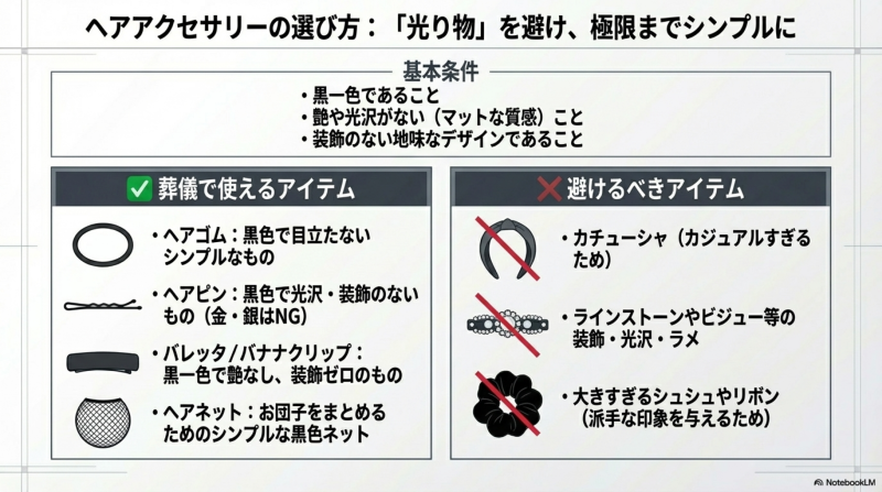 💡 迷った場合は、より控えめなスタイルを選ぶことで故人への敬意を示すことができます。「これは派手すぎるかも」と感じたアクセサリーは使用を避け、最もシンプルな黒のヘアゴムやヘアピンを選ぶのが無難です。