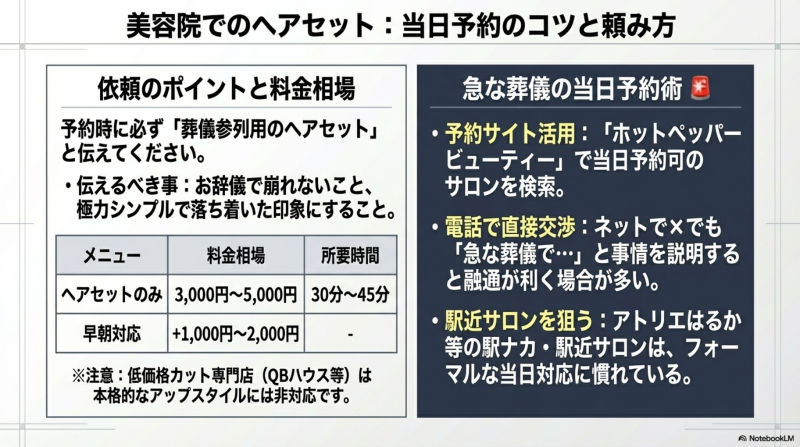 どうしても美容院の予約が取れない場合は、黒髪スプレーやヘアピン・黒ゴムを事前に用意しておき、セルフアレンジで対応しましょう。急な葬儀での服装準備については「喪服レンタル当日・即日対応ガイド|おすすめ店舗・料金比較」も参考になります。