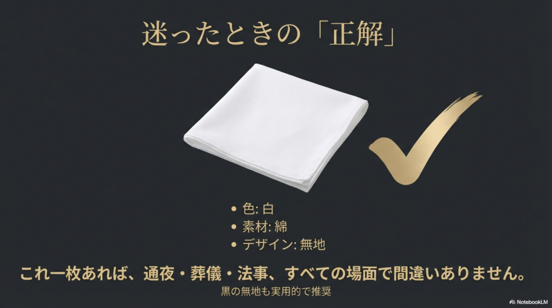 基本的には地味で落ち着いた色のフォーマルな印象のハンカチを選べば問題ありません。迷った場合は白色または黒色の無地が最も無難な選択です。