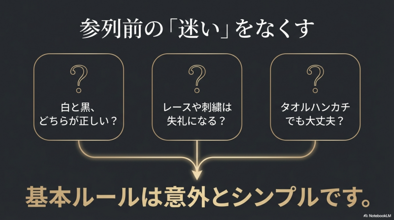 黒いハンカチは葬式で使っても全く失礼ではありません。むしろ喪服に合わせやすく、実用的な選択として広く受け入れられています。
