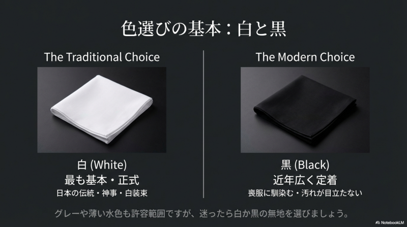伝統的には白色が正式とされていますが、現代では黒色も一般的です。黒いハンカチを選ぶメリットとして、喪服との色合わせがしやすく、汚れも目立ちにくいという実用面があります。
