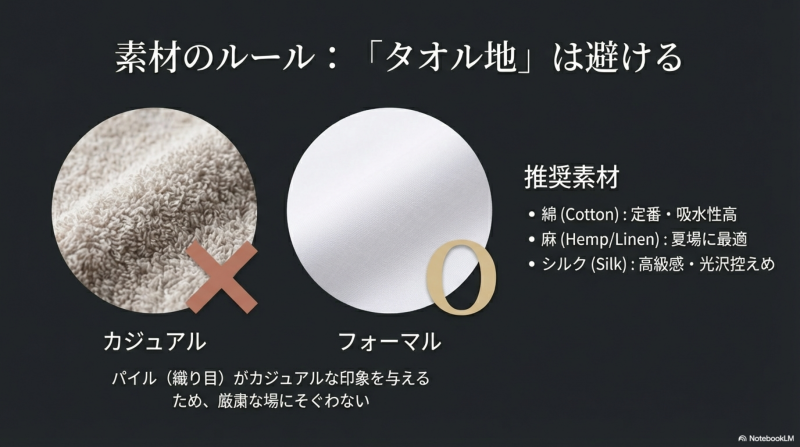 同様に避けるべき素材として、ガーゼ生地やワッフル生地なども挙げられます。これらは日常使いには快適ですが、フォーマルな場には不向きです。