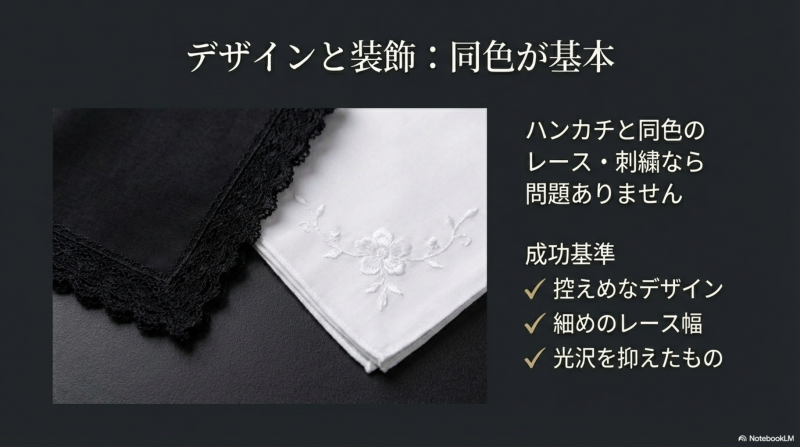 レースや控えめな刺繍が施されたハンカチも問題なく使用できます。ただし、ハンカチ本体と同色の装飾を選び、派手な柄や光沢のあるものは避けましょう。素材は綿・麻・シルクなどフォーマルな印象のものを選び、タオルハンカチは使用を控えてください。