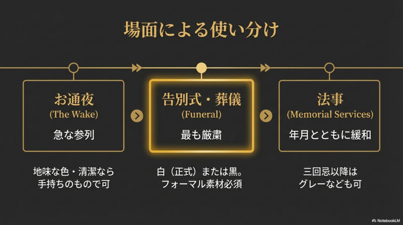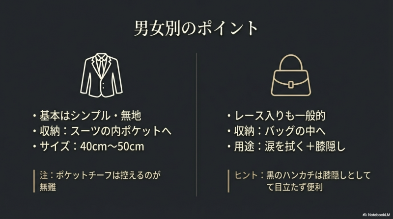 葬式で使用するハンカチは、基本的なマナーとして男女共通の部分が多いですが、それぞれの装いや使用シーンに合わせた選び方のポイントがあります。