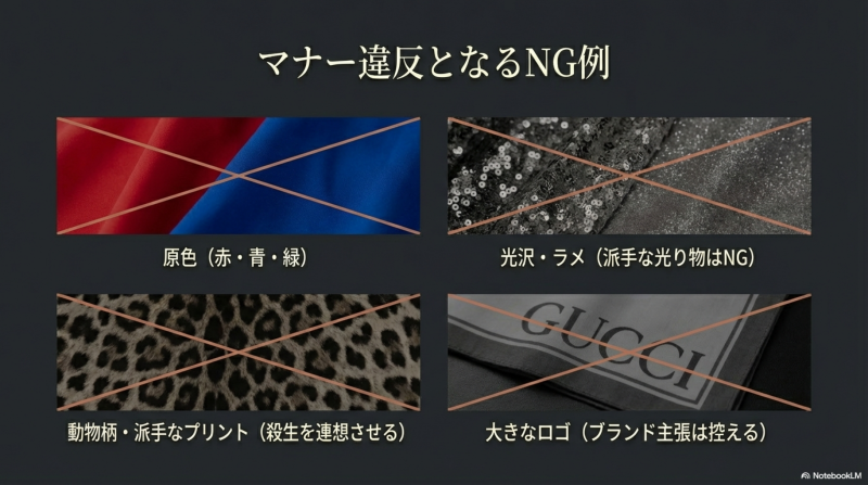 葬儀ではフォーマルな印象を与える素材を選ぶことが重要です。以下の素材は避けましょう。
