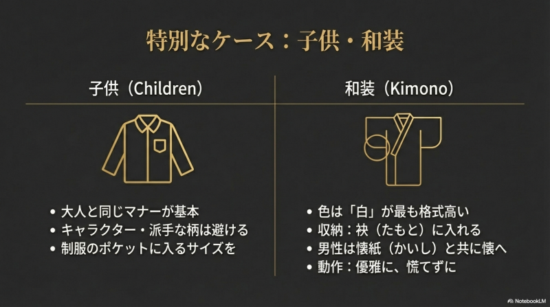 通常の葬式参列に加え、特別な状況でのハンカチのマナーについても知っておくと安心です。それぞれの場面に合わせた適切な対応を解説します。