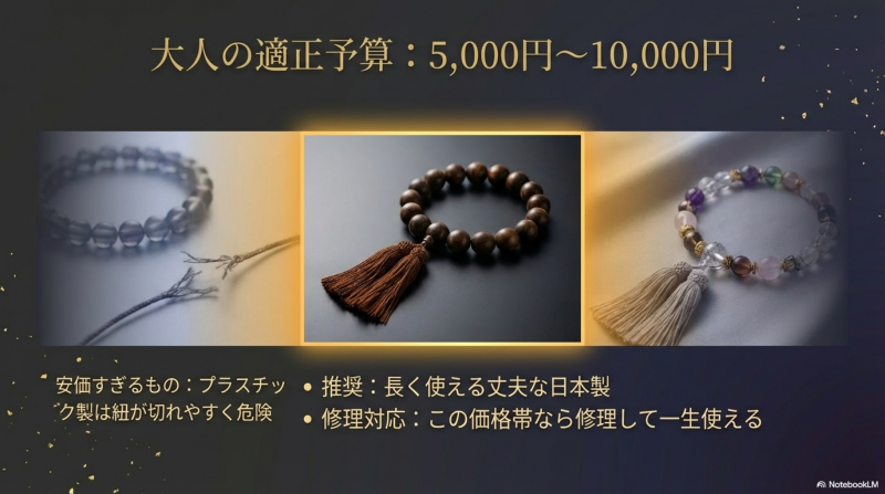 数珠専門店の亀屋では、高価なものは不要だが「長く使える丈夫な日本製」を選ぶことを推奨しており、1,500円以上を目安にすれば比較的買い求めやすく品質も確保できるとしています。