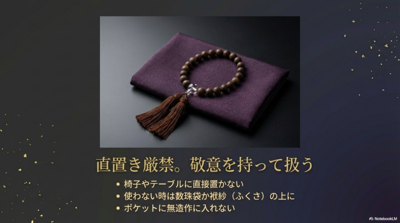 数珠は仏具として丁寧に扱うことが求められますが、過度に緊張する必要はありません。故人への敬意を忘れずに自然に振る舞うことが大切です。