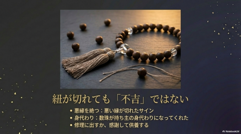 しかし、これらはあくまで俗説であり、仏教の教えとは何の関係もありません。数珠を買うことと不幸があることに因果関係は存在せず、迷信に惑わされる必要はありません。