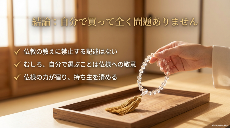 仏教的な観点から見ても、数珠を自分で購入することに問題はまったくありません。数珠には仏様のチカラが宿り、持ち主を清めるとされているため、むしろ自分で選んで購入することは仏様への敬意を表す行為です。