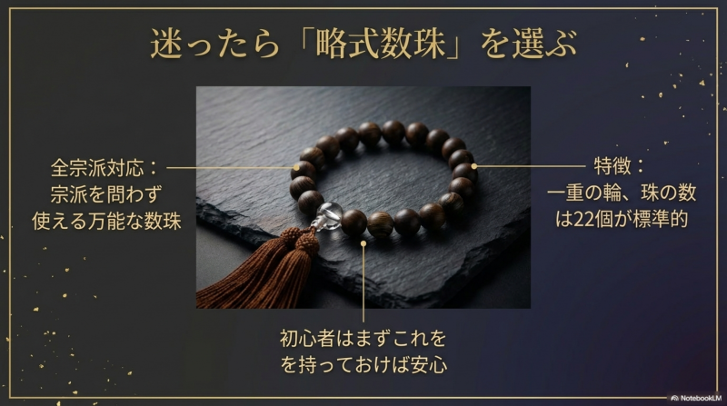 初めて購入する方は、すべての宗派で使える略式数珠(22珠)を5,000円〜1万円の価格帯で選ぶのがおすすめです。100均の数珠は緊急時の選択肢にはなりますが、長期使用には正式な数珠を別途用意しましょう。