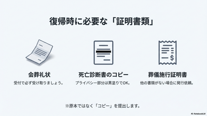 職場に提出する証明書類は、葬儀が実際に行われたことを証明する目的 のみであり、詳細な個人情報まで開示する必要はありません。