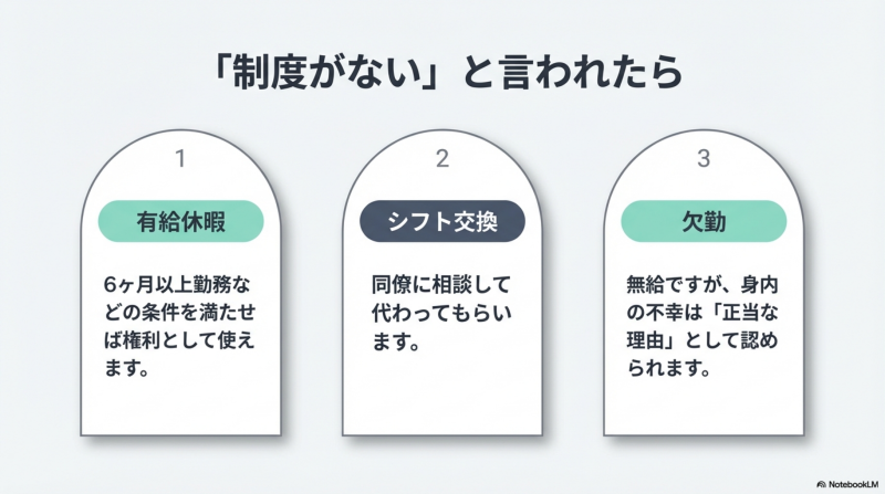 シフト制で働いている場合、シフトの変更や交代 を依頼する方法があります: