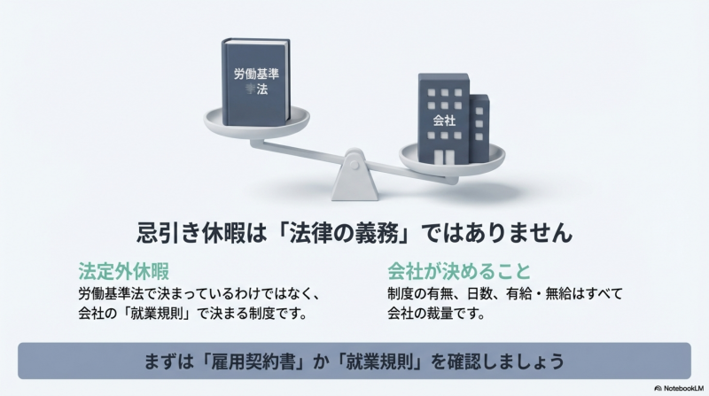 重要なポイントは、忌引き休暇は 労働基準法で法的に義務付けられた制度ではない ということです。有給休暇は労働基準法によってすべての労働者に権利が保障されていますが、忌引き休暇は各企業が就業規則で独自に定めている「法定外休暇」に分類されます。