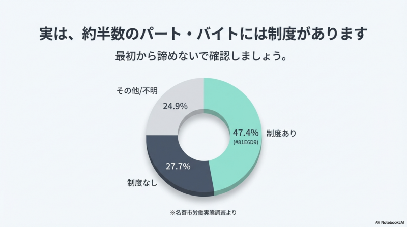 このデータから、非正規雇用の 約半数(47.4%)は何らかの形で忌引き休暇制度が適用 されていますが、27.7%は制度そのものが存在しない という実態が明らかになっています。