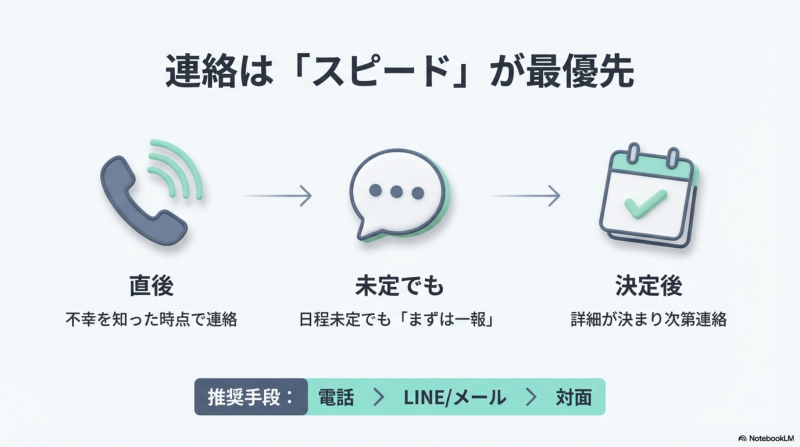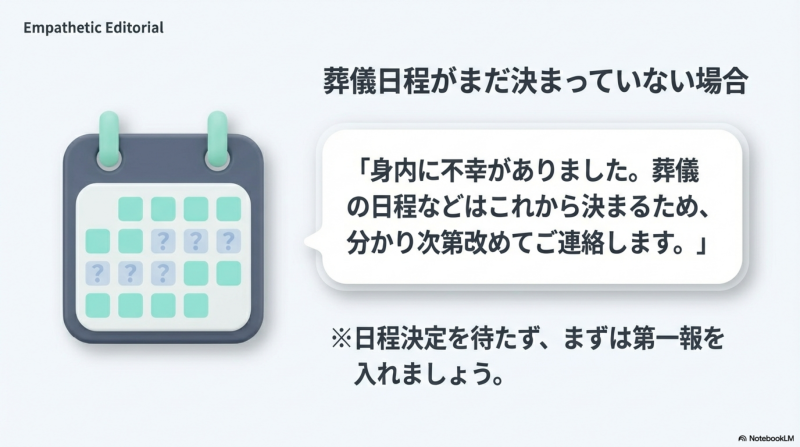 - 葬儀日程が未定でも、まずは不幸があったことを伝える