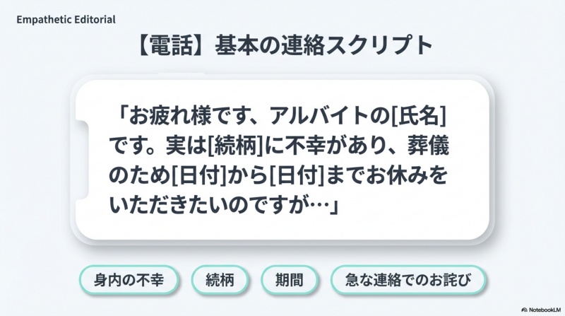 身内に不幸があり、葬儀に参列しなければならないのに「バイトだから休めないのでは」「給料はどうなるんだろう」と不安で職場に連絡できず、悩んでいませんか。突然の出来事で混乱している中、上司にどう伝えればいいか分からず、時間だけが過ぎていく焦りと恐怖。