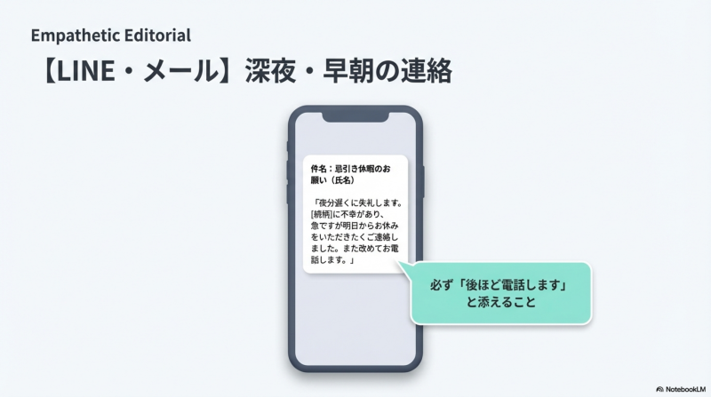 深夜や早朝の場合は、常識的な時間(朝7時以降、夜9時まで)になってから連絡するか、LINEやメールで先に連絡を入れ、翌朝に改めて電話する方法もあります。