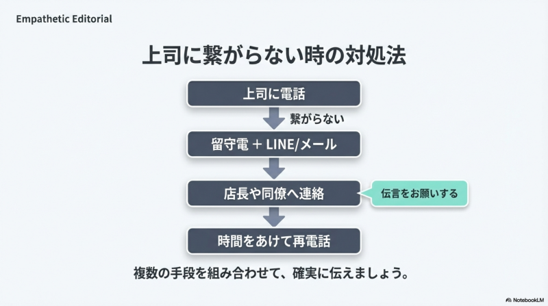 基本的には 電話が最も確実 ですが、職場の通常連絡手段に従うことも重要です:
