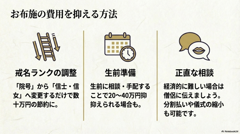 費用面に不安がある場合は、戒名ランクの見直しや僧侶派遣サービスの活用、生前準備などで費用を抑えることが可能です。僧侶に経済状況を率直に相談すれば、分割払いや金額調整に応じてもらえるケースも多くあります。