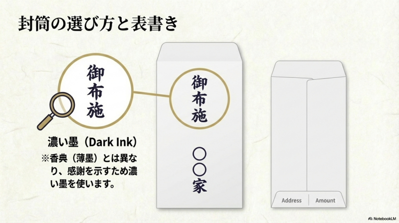 - 表書きは「御布施」が正しく、「御霊前」「戒名料」は使わない