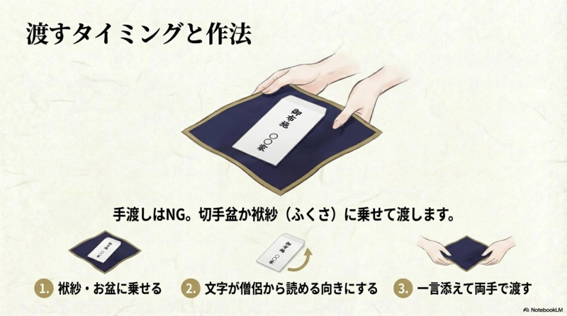 - 僧侶から見て封筒が正面になるよう向きを調整する
