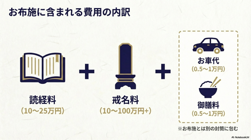 お布施の総額は、複数の費用で構成されています。内訳を理解しておくと、適正金額の判断に役立ちます。