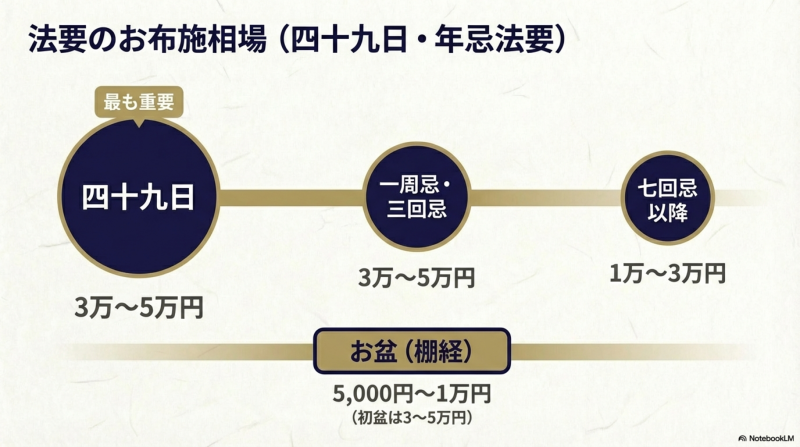| 納骨法要 | 3万円〜5万円 | 四十九日と同日に行う場合も多い |