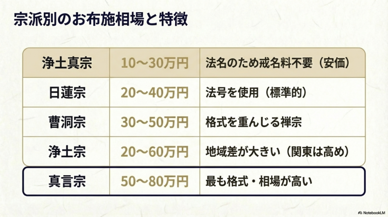 宗派によってお布施の金額や戒名の考え方は異なります。主要5宗派の相場を解説します。
