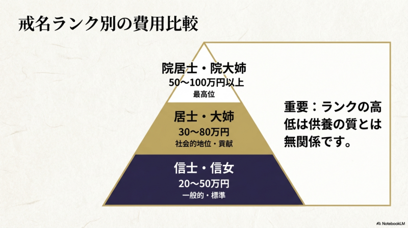戒名料はお布施総額の50〜70%を占める場合も多く、ランクの選択が費用に直結します。