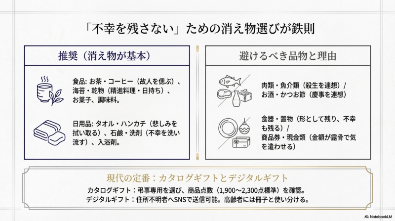 香典返しの品物は「消え物」(使えばなくなるもの)が基本です。不幸が形として残り続けないようにという配慮から、日常的に消費できるものや使い切れるものが選ばれています。