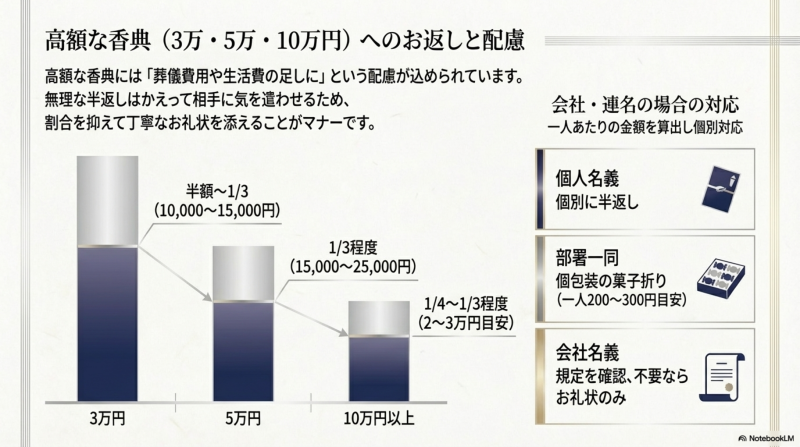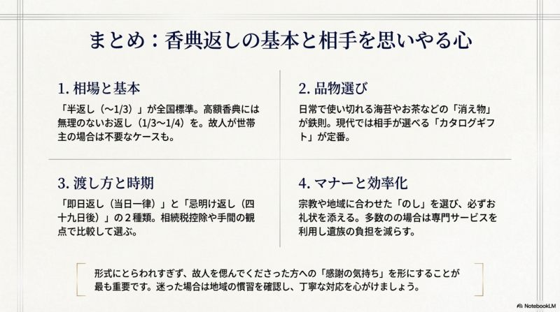 半返しはあくまで目安であり、絶対のルールではありません。高額香典の場合は3分の1〜4分の1でも適切ですし、故人が世帯主の場合は不要とされることもあります。