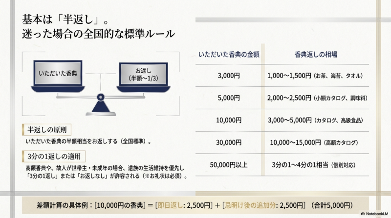 基本は「半返し」というシンプルなルールです。この原則を軸に、地域や状況に応じた適切な対応方法を順番に解説していきます。