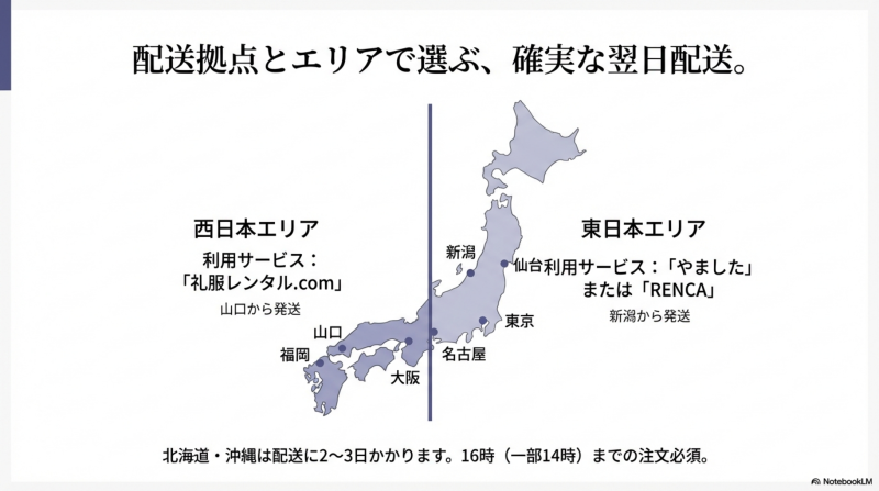 礼服レンタル.comから14時までに注文すれば、大阪・福岡で翌日午前中に届きます。西日本エリアでは最も配送が早いサービスです。