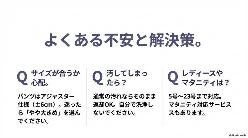 サイズ選びでは、普段のスーツサイズではなく身長・体重・胸囲・ウエストを正確に入力することが重要です。迷ったらやや大きめを選ぶのが安全です。パンツにはアジャスター機能が付いており、ウエストは前後6cm程度の調整が可能です。