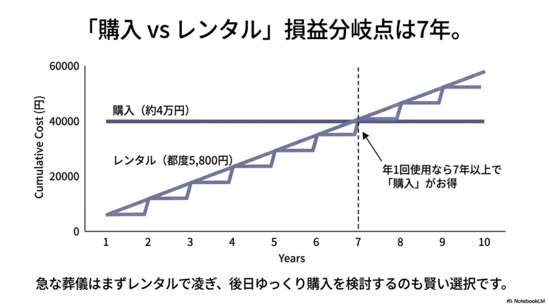 購入とレンタルの判断は今後の使用頻度で決まります。年1回・7年以上使うなら購入、それ以下ならレンタルが割安です。急な葬儀ではまずレンタルで対応し、後日改めて購入を検討する方法もおすすめです。