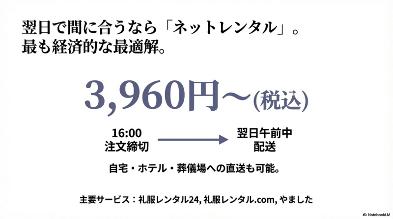 翌日の通夜・葬儀に間に合わせるなら、16時までの注文で翌日午前配送に対応したネットレンタルが経済的です。基本セット3,960円〜、フルセットでも5,800円前後で、自宅・ホテル・葬儀場への直送にも対応しています。