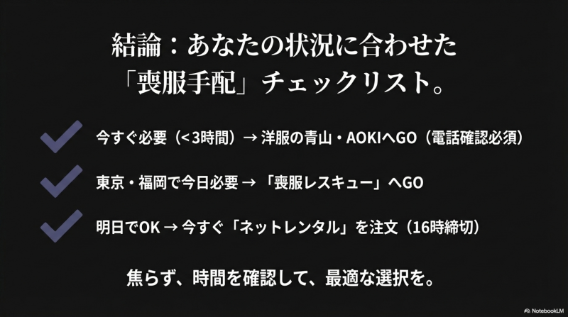 読み終えれば、葬儀までの残り時間に応じた最適な入手方法と費用の目安が分かります。結論として、当日なら紳士服店の即日購入(最短15分)か店舗レンタル、翌日以降ならネットレンタル(3,960円〜)が最もコストを抑えられる方法です。