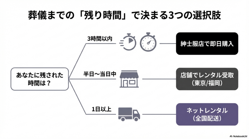 当日中に必要なら紳士服店での即日購入が最も確実です。東京都内・福岡なら喪服レスキュー(計15店舗・24時間営業)での店舗レンタルも選択肢になります。翌日以降で間に合うならネットレンタル(3,960円〜)が最も経済的です。